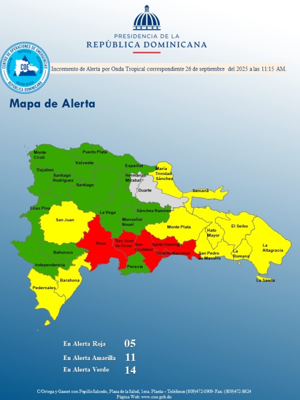 El COE mantiene 08 provincias y al Distrito Nacional en alerta roja, aumenta 13 en amarilla y mantiene 03 en verde, debido a que la tormenta tropical Melissa, No. 13 de esta Temporada Ciclónica 2025, fue localizada recientemente a unos 485 kilómetros al sur/suroeste de Puerto Príncipe (Haití).
