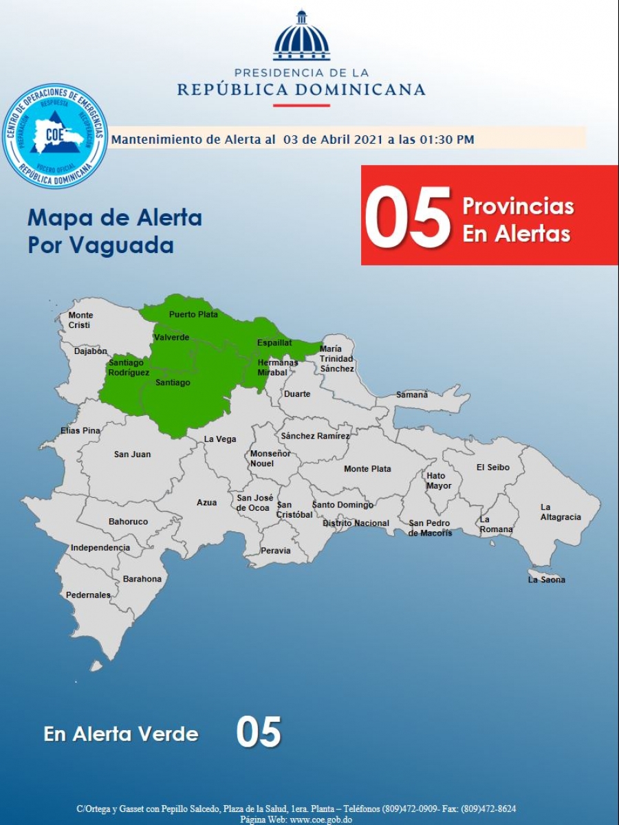 El Centro de Operaciones de Emergencias (COE) emitió este sábado alerta verde para cinco provincias de la región Cibao por el impacto de una vaguada y los efectos de un sistema frontal que generará aguaceros moderados y fuertes.