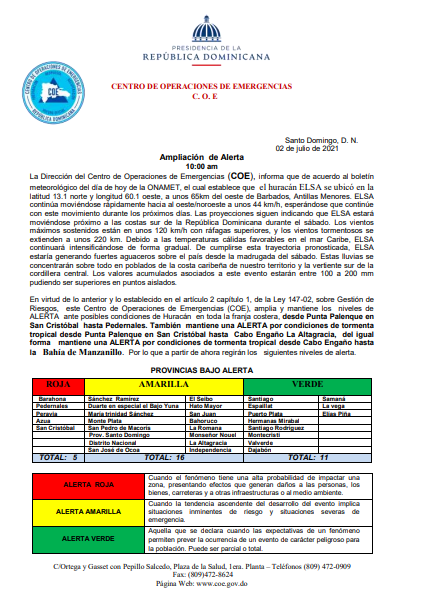 De acuerdo al reporte meteorológico, el huracán Elsa estará moviéndose próximo a las costas sur de la República Dominicana durante el día de mañana; por lo que se espera que se generen fuertes aguaceros sobre el país desde la madrugada de este sábado. Las lluvias se concentrarán en poblados de la costa caribeña de nuestro territorio y la vertiente sur de la cordillera central, ante ellos el COE incrementó los niveles de alerta.