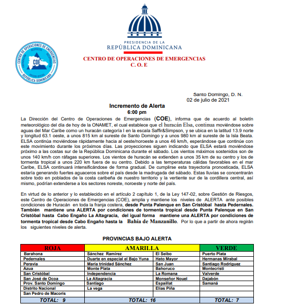 ¡Incremento de Alerta! La Dirección del Centro de Operaciones de Emergencias (COE), informa que de acuerdo al boletín meteorológico del día de hoy 2/07/2021 de la ONAMET, el cual establece que el huracán Elsa, continua moviéndose