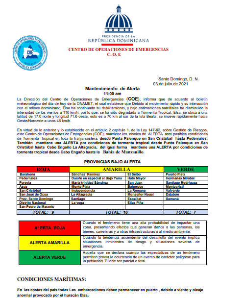 Ante ello, el COE mantiene alerta roja para Barahona, Pedernales, Peravia, Azua, San Cristóbal, San José de Ocoa, Prov. Santo Domingo, Distrito Nacional y San Pedro de Macorís.