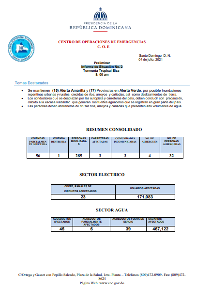 Informe de Situación No. 2 Tormenta Tropical Elsa