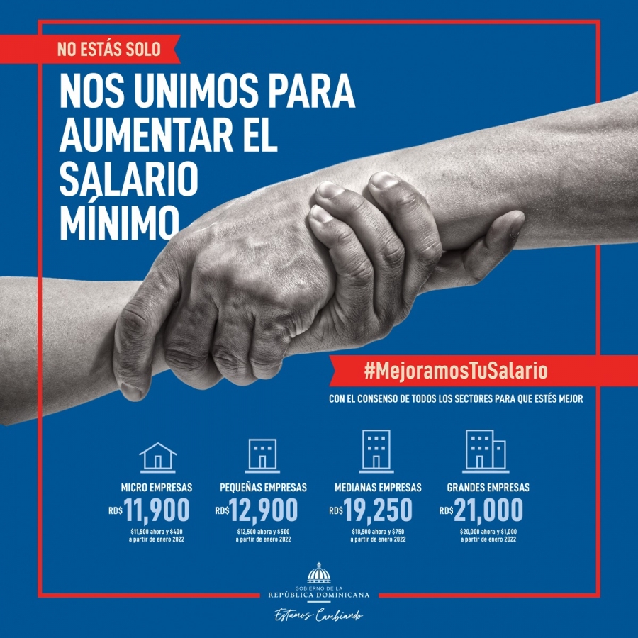 Para las micro empresas se acordó un aumento del 11% para llegar a RD$11,900 pesos (RD$ 11,500 ahora y $400 más en enero 2022), un aumento de un 20.2% para las pequeñas empresas hasta llegar a RD$12,900 pesos (RD$12,400 ahora y RD$500 pesos más en enero 2022), un 59% para las medianas empresas hasta llegar a RD$19,250 pesos (RD$18,500 ahora y RD$750 pesos más en enero 2022) y un 19% para grandes empresas hasta llegar a RD$21,000 pesos (RD$20,000 ahora y RD$1,000 pesos más en enero 2022).
