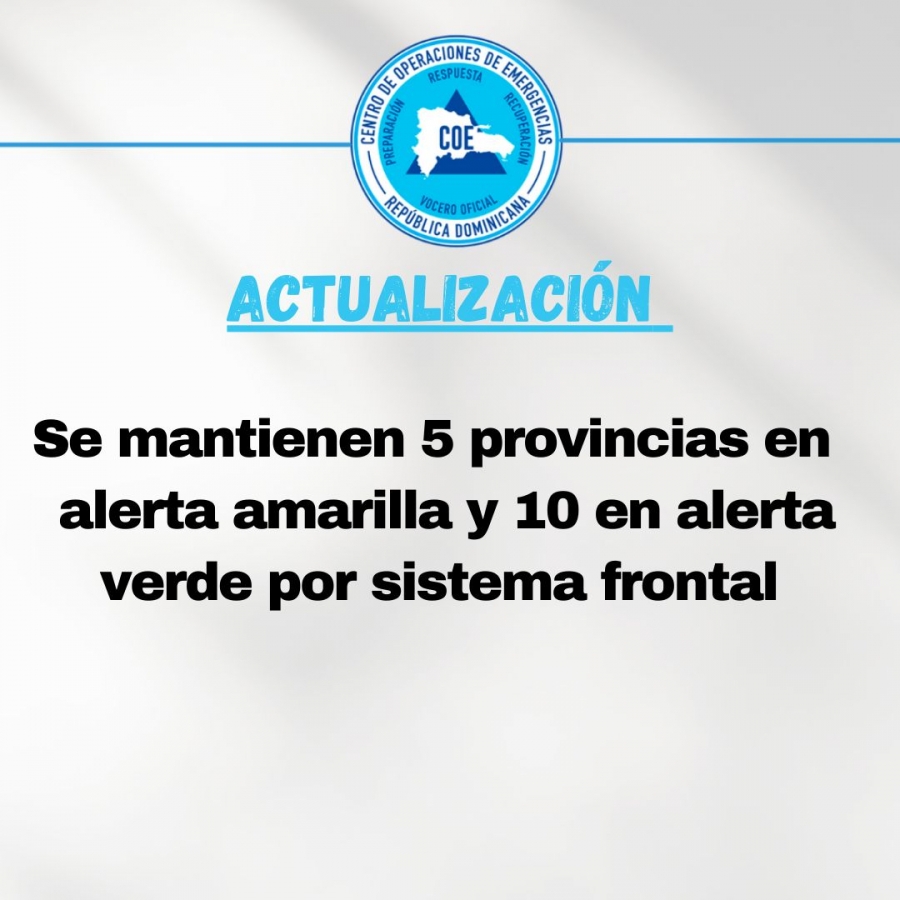 El COE mantiene 15 provincias en alerta amarilla y verde por posibles crecidas de ríos, arroyos y cañadas, así como inundaciones repentinas o urbanas, debido a que la vaguada mencionadas en superficie ya salió de nuestra área de pronóstico, sin embargo, los efectos del viento este/noreste y una nueva vaguada en los niveles bajos de la troposfera, mantendrá la humedad e inestabilidad para que se generen nublados acompañados de aguaceros y ráfagas de viento hasta la media noche.