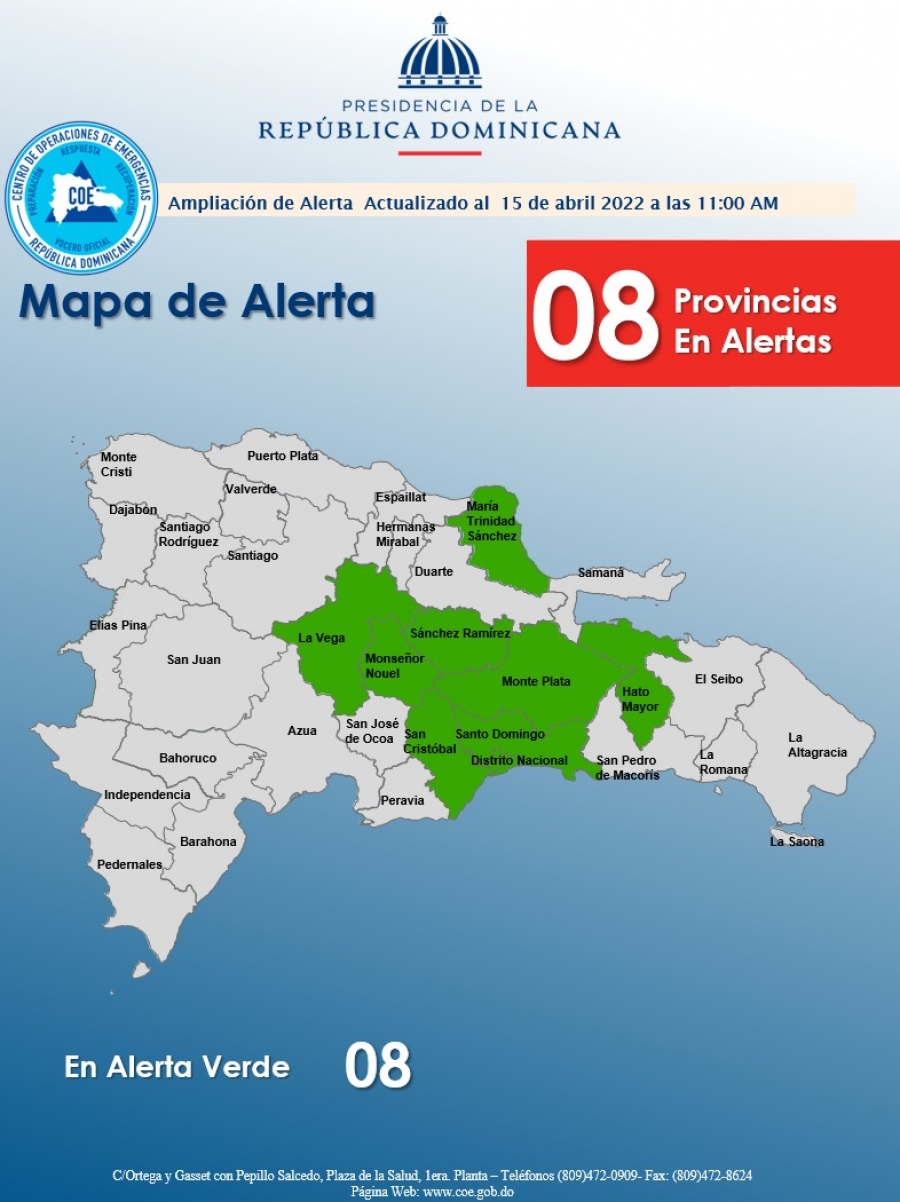 El COE aumenta a 08 las provincias en alerta verde por posibles crecidas de ríos, arroyos y cañadas, así como inundaciones urbanas y repentinas, debido a que una vaguada continúa incidiendo en las condiciones del tiempo favoreciendo que produzcan aguaceros, tormentas eléctricas y ráfagas de viento.