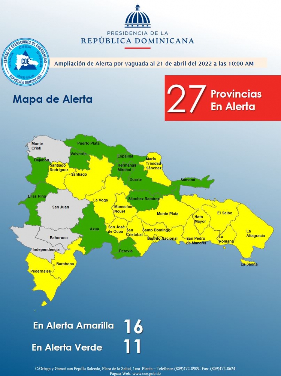 El COE mantiene 16 provincias en alerta amarilla y 11 en alerta verde por posibles crecidas de ríos, arroyos y cañadas, así como inundaciones urbanas y repentinas, debido a que las lluvias continuarán con menor intensidad y frecuencia. Se prevé que en horas de la tarde las precipitaciones estén acompañadas de tormentas eléctricas y ráfagas de viento.