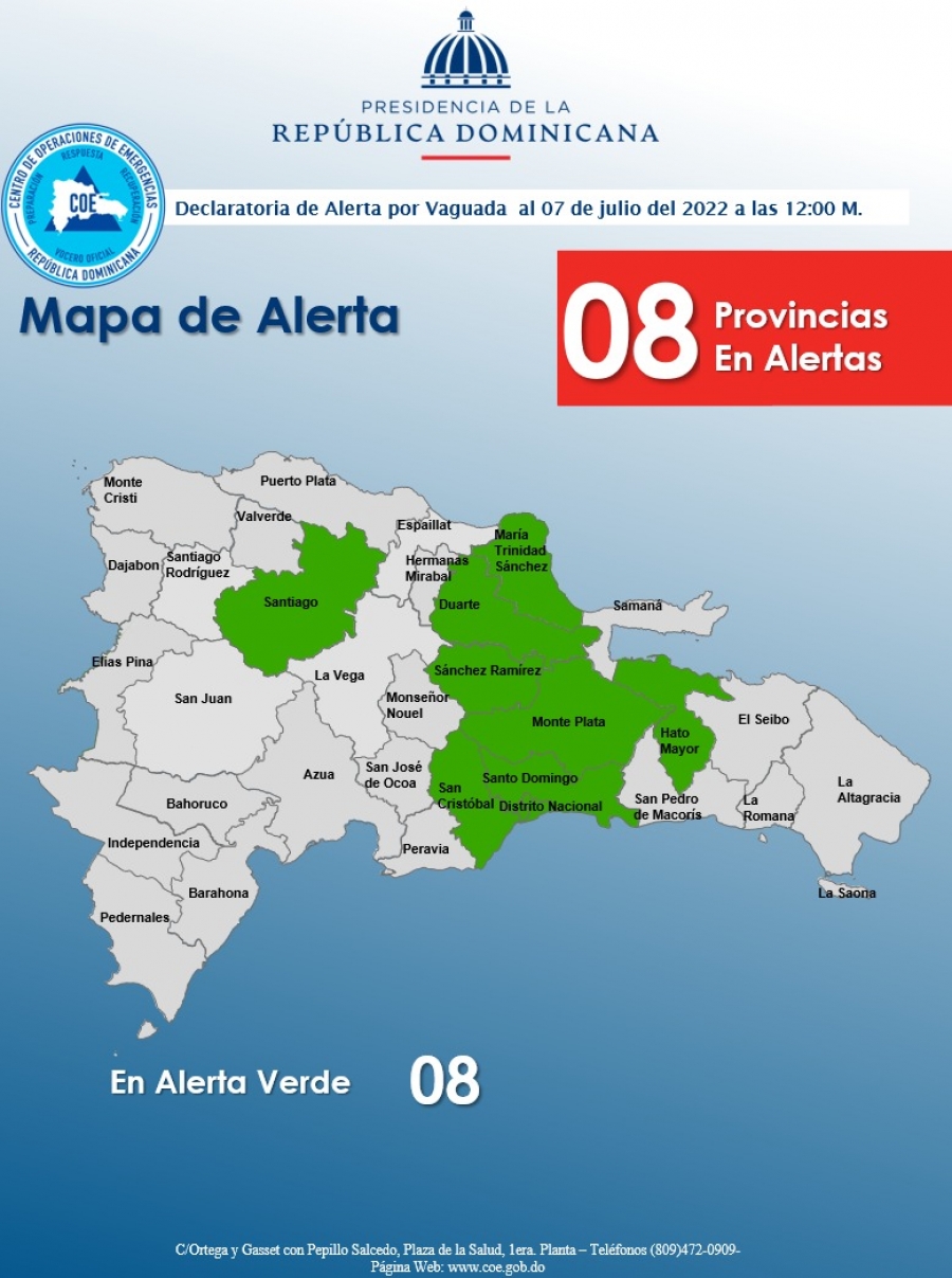 El COE emite alerta verde para 08 provincias por posibles crecidas de ríos, arroyos y cañadas, así como inundaciones repentinas o urbanas, debido a que una vaguada se manifiesta y mantendrá condiciones de inestabilidad sobre el país
