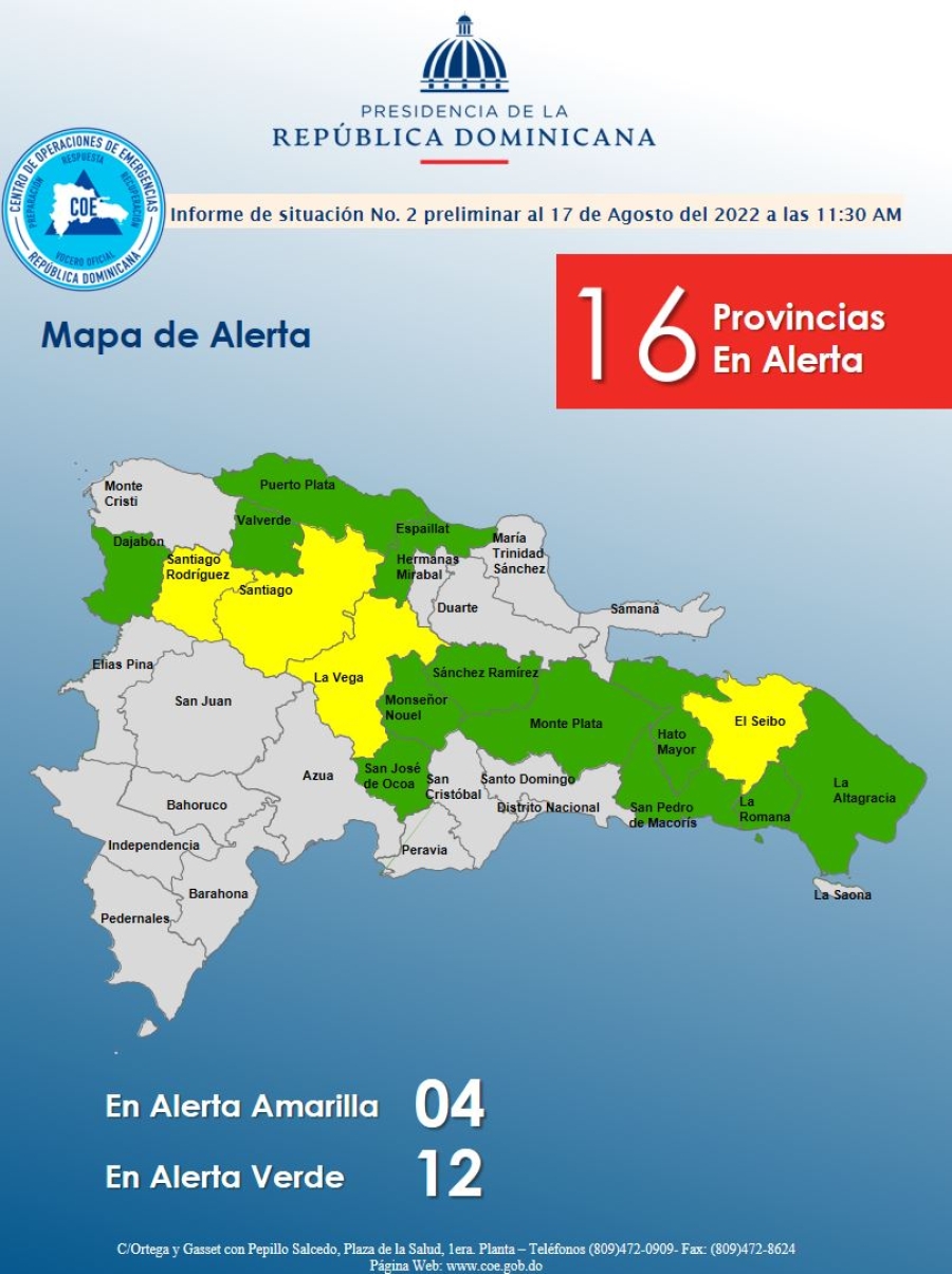 El COE mantiene 04 provincia en alerta amarilla y aumenta a 12 las provincias en alerta verde por posibles crecidas de ríos, arroyos y cañadas, así como inundaciones repentinas o urbanas, debido a que la vaguada que ha provocado las lluvias se combinará con los efectos de otra vaguada.