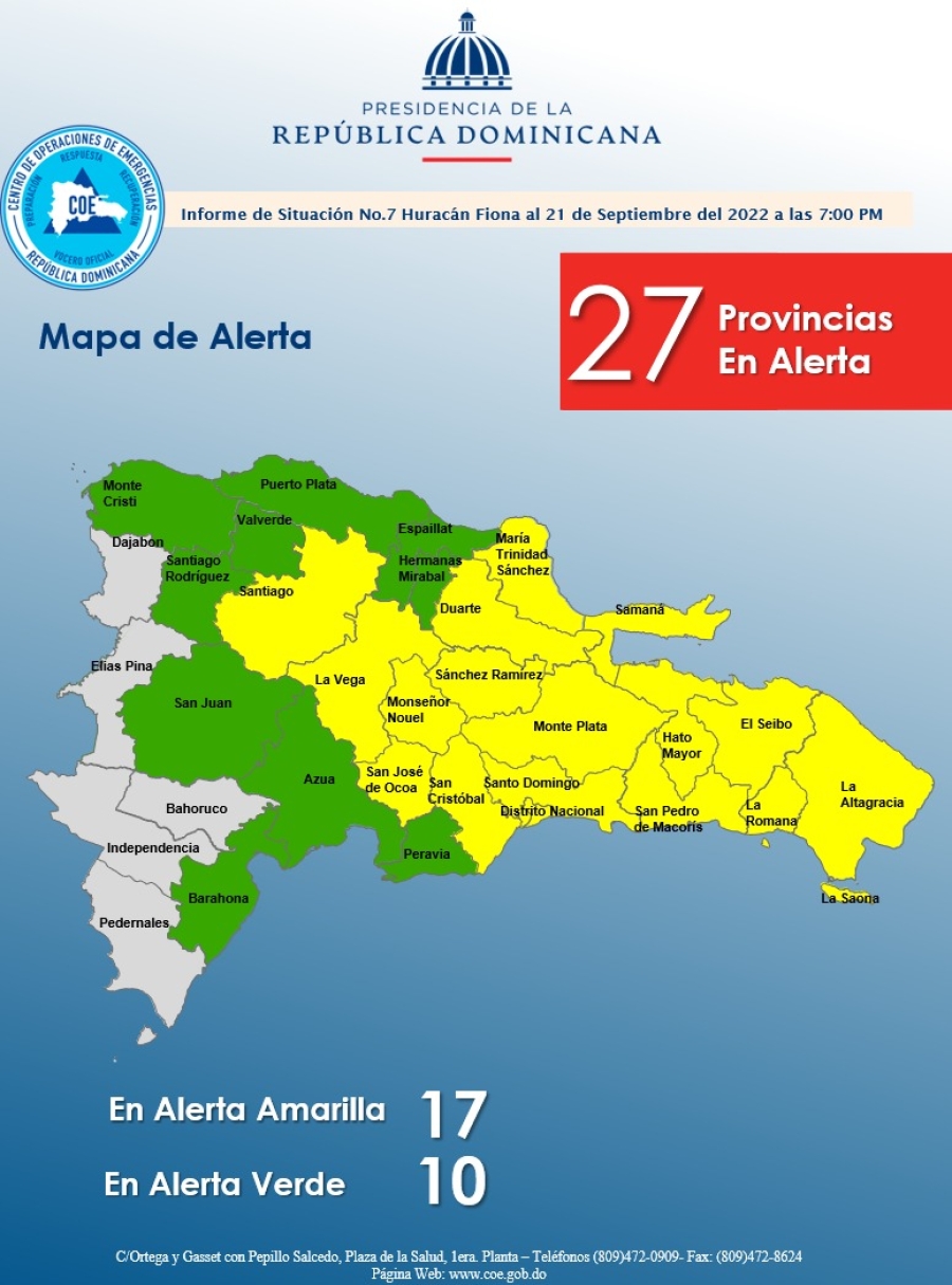 El COE mantiene 17 provincias en alerta amarilla y 10 en alerta verde debido a que los efectos indirectos del huracán #Fiona seguirán provocando aguaceros, con tormentas eléctricas y ráfagas de viento.