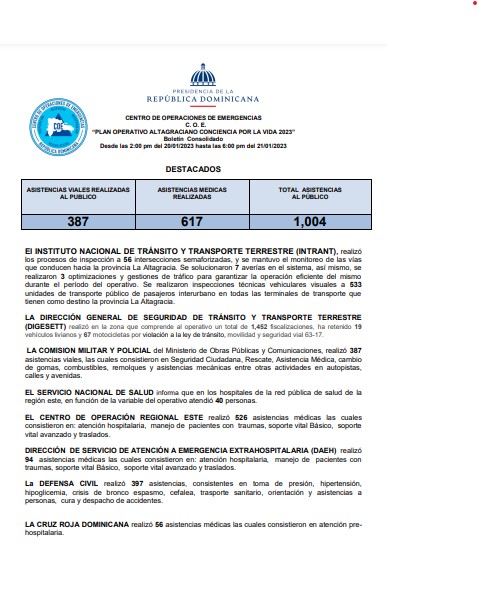 “PLAN OPERATIVO ALTAGRACIANO CONCIENCIA POR LA VIDA 2023” Boletín Consolidado Desde las 2:00 pm del 20/01/2023 hasta las 6:00 pm del 21/01/2023