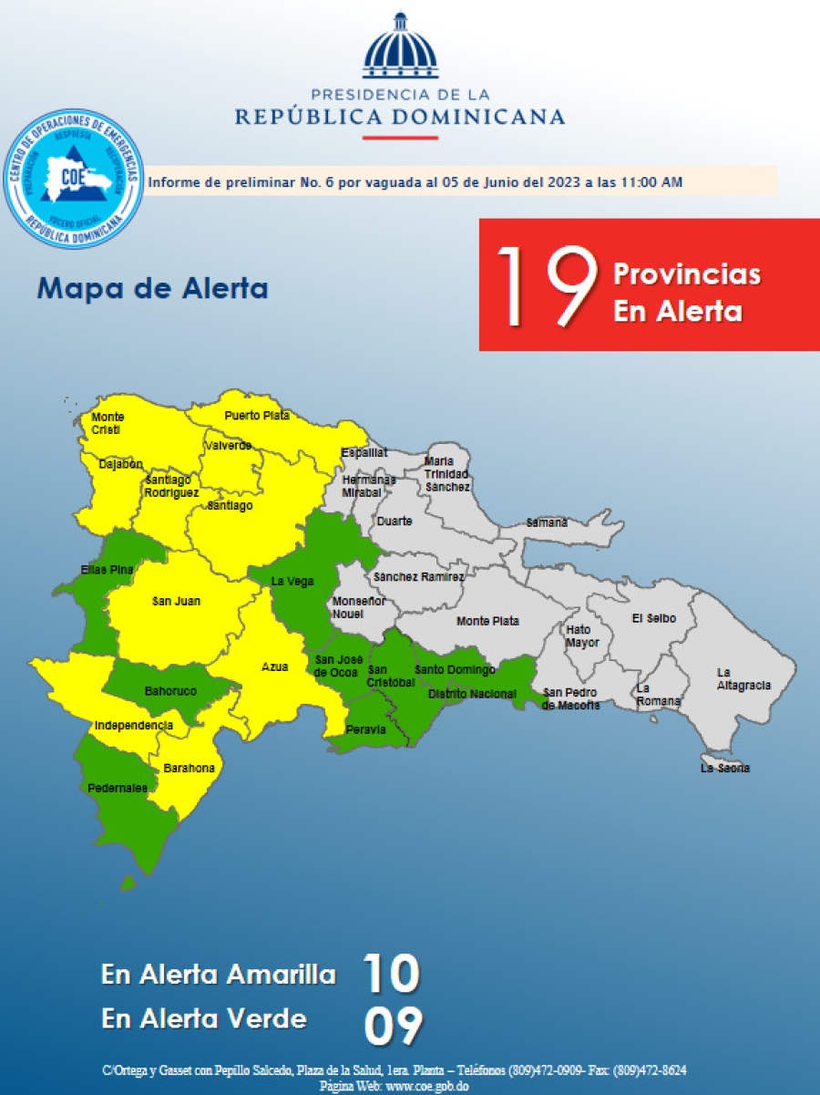 El COE mantiene 10 amarilla y coloca 09 en verde por posibles crecidas de ríos, arroyos y cañadas, así como inundaciones repentinas o urbanas, debido a que se pronostican aguaceros de moderados a fuertes con tormentas eléctricas y ráfagas de viento.