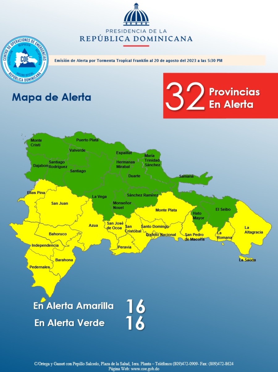 El COE coloca 16 provincias en alerta amarilla y 16 en verde por posibles crecidas de ríos, arroyos y cañadas, así como inundaciones repentinas o urbanas, por los efectos que se sentirán desde este lunes por la Tormenta Tropical Franklin, que se localizará al sur de la isla sobre aguas del mar Caribe.