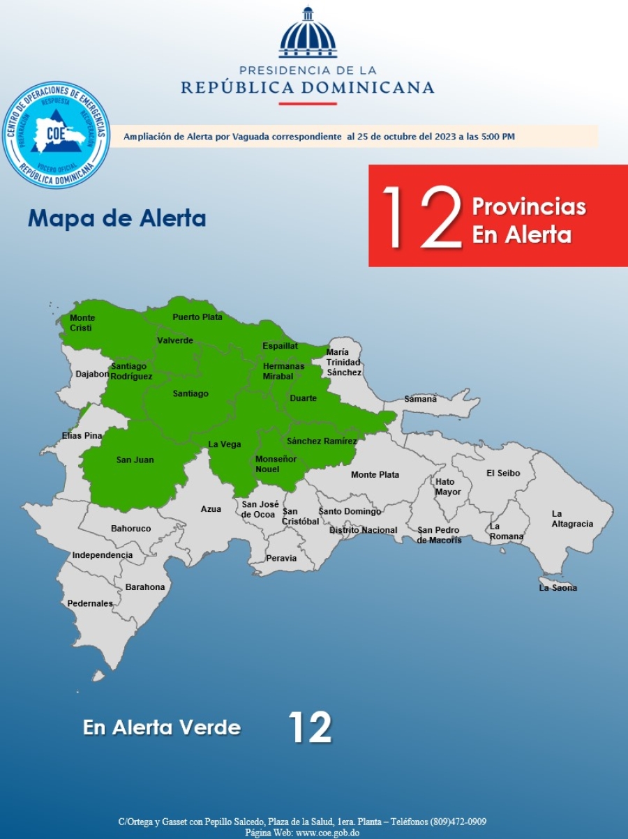 El COE amplia a 12 las provincias en alerta verde por posible crecida de ríos, arroyos y cañadas, debido a que la inestabilidad generada por una vaguada más los campos nubosos asociados al huracán Tammy han estado generando y continuarán generando aguaceros moderados a fuertes.
