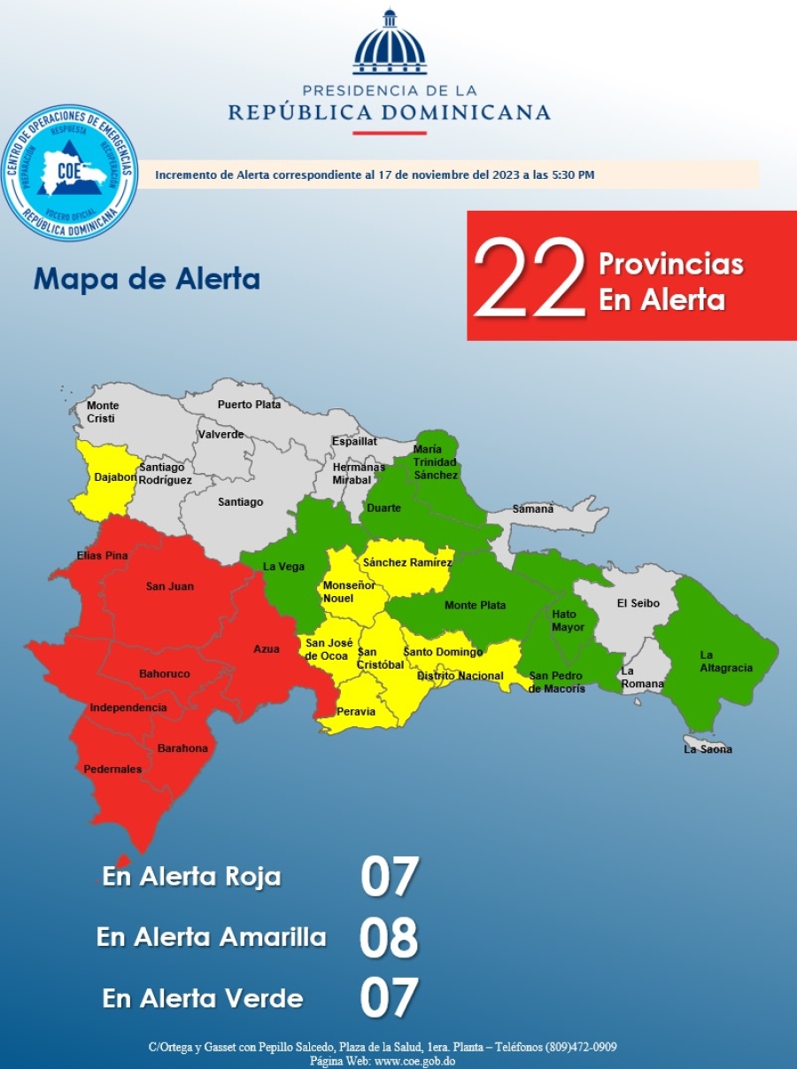 El COE mantiene 07 las provincias en alerta roja, e incrementa 10 en amarilla y 09 en verde por posible crecida de ríos, arroyos y cañadas debido a que el potencial ciclón tropical posee vientos máximos sostenidos de hasta 55 kph y se desplaza hacia el noreste a una velocidad de 28 kph.