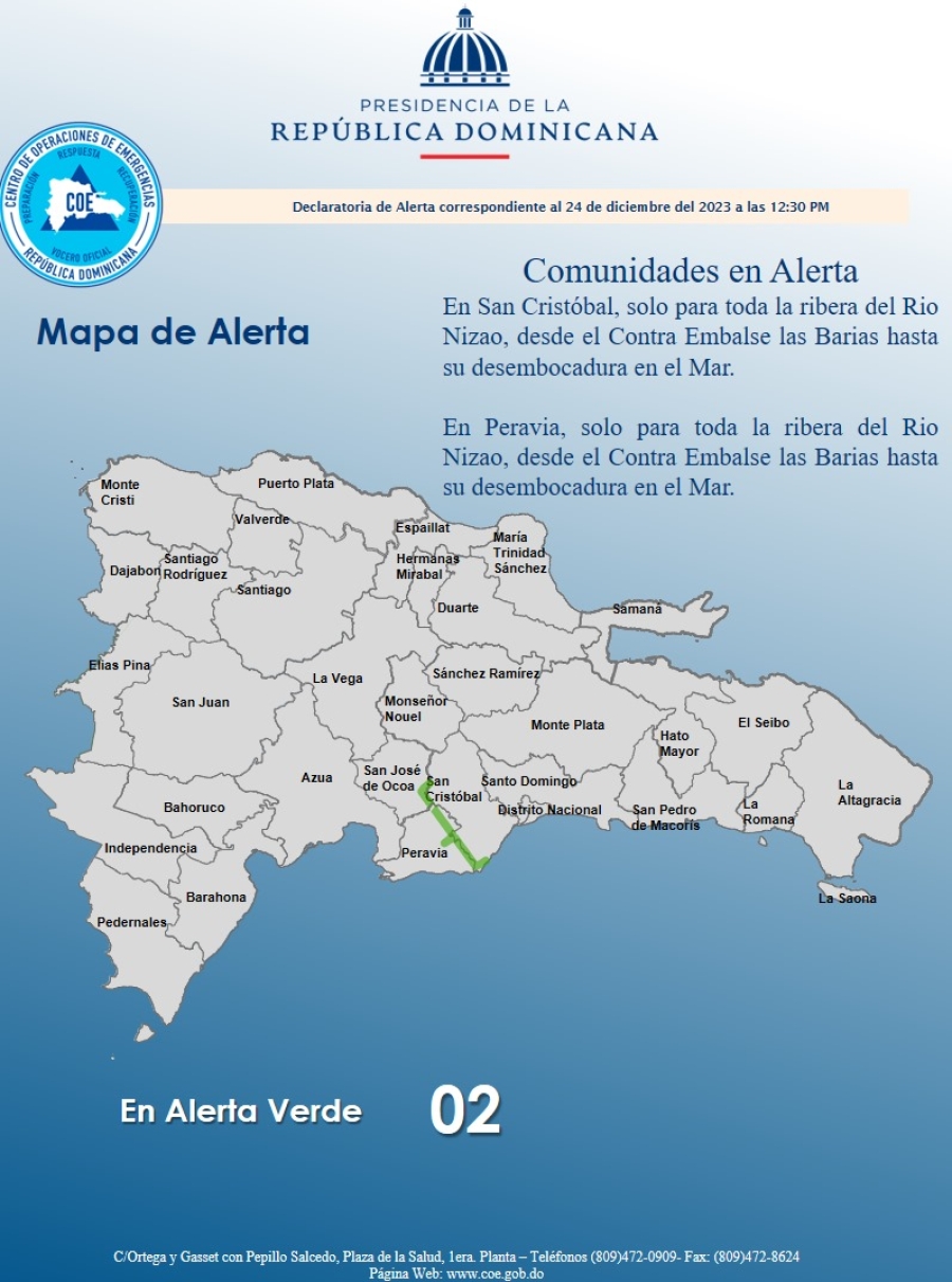 Asimismo, las personas no deben hacer uso de los balnearios rio debajo del Contra Embalse Las Barias, hasta su desembocadura en mar, también las personas deben abstenerse de cruzar ríos, arroyos y cañadas del Rio Nizao, que presenten alto volúmenes de agua, debido a la turbiedad y el volumen de agua.