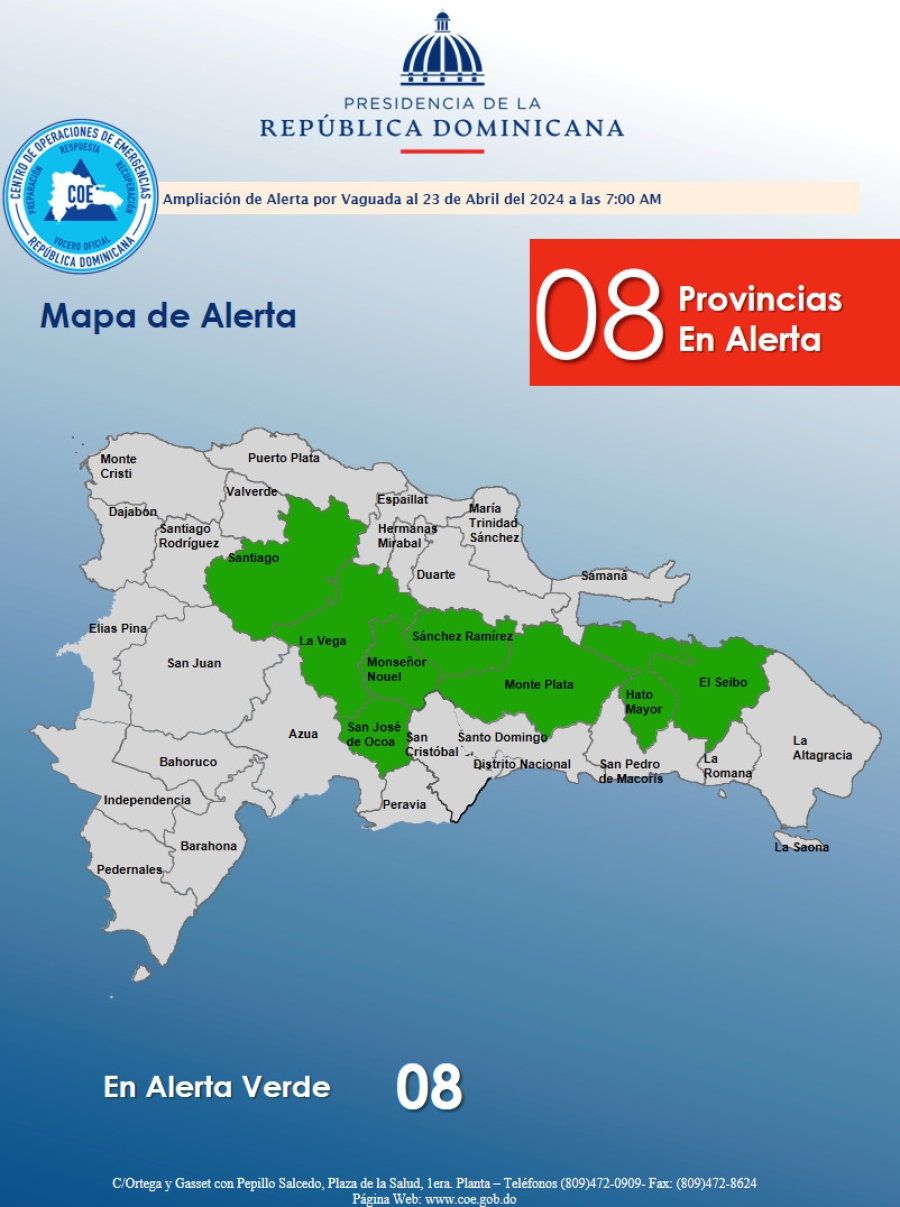 El COE aumenta 08 provincias en alerta verde por posible crecida de ríos, arroyos y cañadas, debido a que continuarán los aguaceros de moderados fuertes con tormentas eléctricas y ráfagas de viento; producto de una vaguada, junto a abundante humedad y los efectos locales, hacia las regiones noreste, sureste y suroeste.