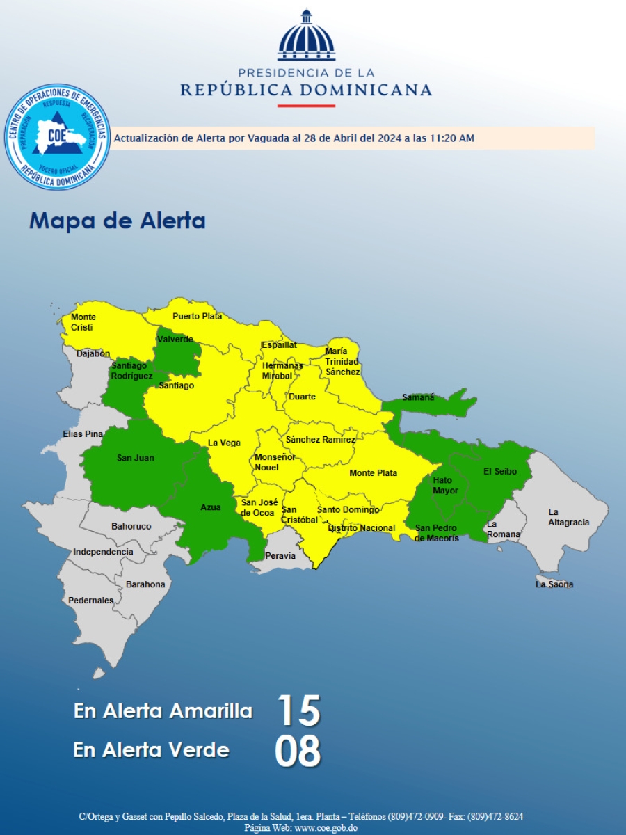 El COE mantiene 14 provincias y al Distrito Nacional en alerta amarilla y 08 en verde, debido a que tendremos suficiente humedad e inestabilidad proporcionada por la vaguada que afecta nuestro territorio, por lo que continuarán los aguaceros de moderados a fuertes en varias provincias del país.