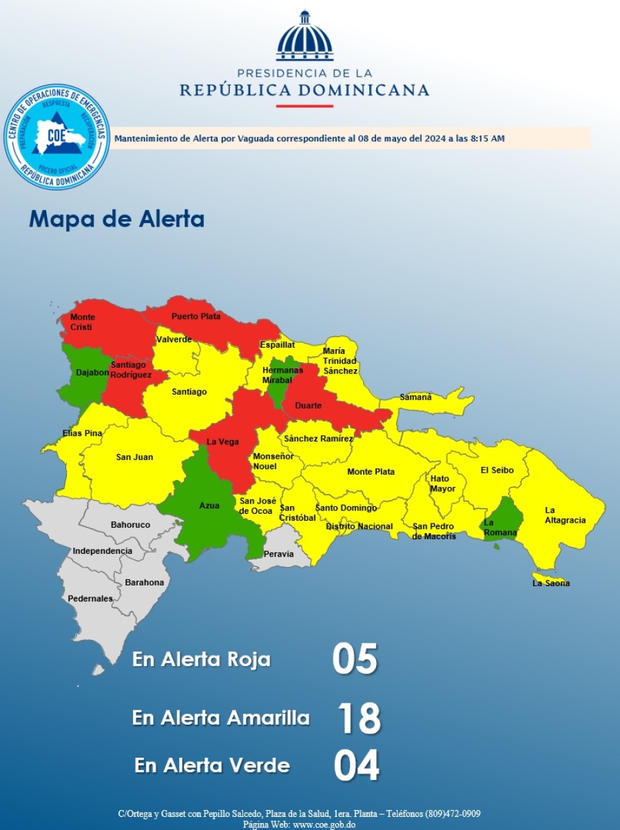 El COE mantiene varias comunidades y 05 provincias en alerta roja, 17 y al Distrito Nacional en amarilla y 04 en verde, debido a que una vaguada continúa provocando un ambiente húmedo e inestable, generando fuertes lluvias, tronadas y ráfagas de viento.