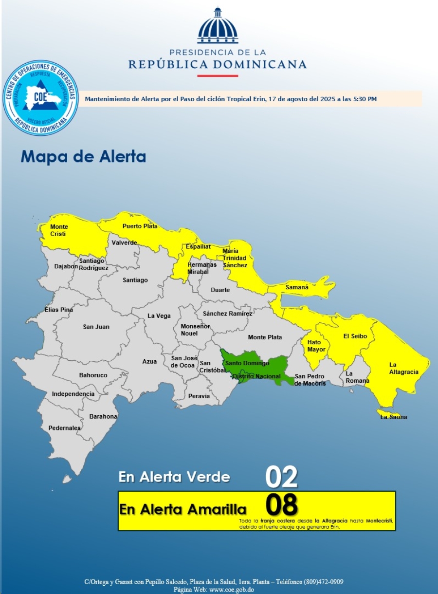 El COE mantiene 08 provincias en alerta amarilla y 01 y al Distrito Nacional en verde, debido a que el huracán Erin, categoría 3, ahora posee vientos máximos sostenidos estimados en 205 km/h.