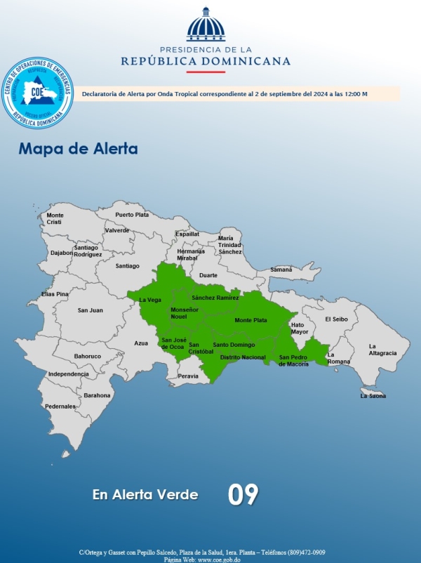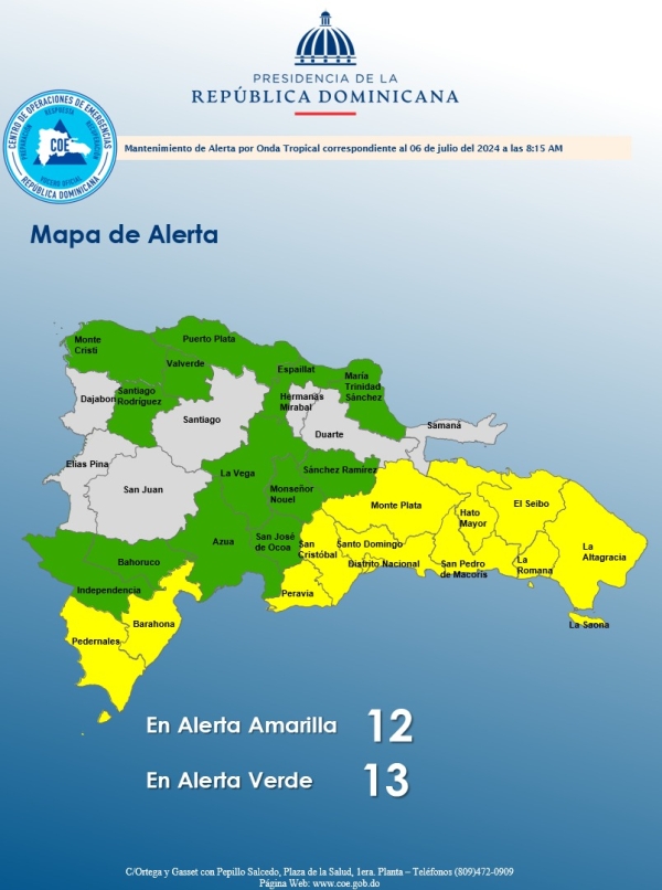 El COE incrementa 07 provincias y al Distrito Nacional en alerta amarilla y mantiene 10 en verde, debido a que se prevé un aumento significativo de la humedad e inestabilidad sobre nuestro territorio, asociado a una activa onda tropical localizada sobre Puerto Rico con bajo potencial ciclónico.