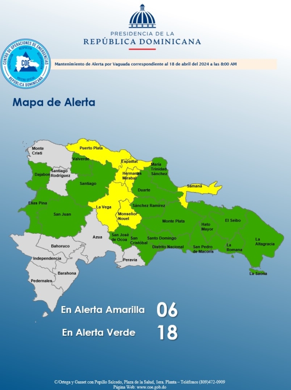 El COE mantiene 07 provincias y al Distrito Nacional en alerta amarilla y 11 en verde, debido a que continúan las condiciones favorables para que sigan produciéndose aguaceros de moderados a fuertes en ocasiones, tormentas eléctricas y ocasionales ráfagas de viento a causa de la vaguada ubicada al noreste del país.