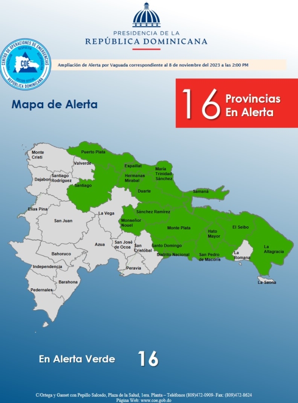 El COE coloca 07 las provincias en alerta roja, 07 en amarilla y 05 en verde por posible crecida de ríos, arroyos y cañadas debido a que el potencial ciclón tropical, que se ubica a unos 415 kilómetros al oeste/suroeste de Kingston, Jamaica, podría evolucionar a tormenta tropical mañana sábado.
