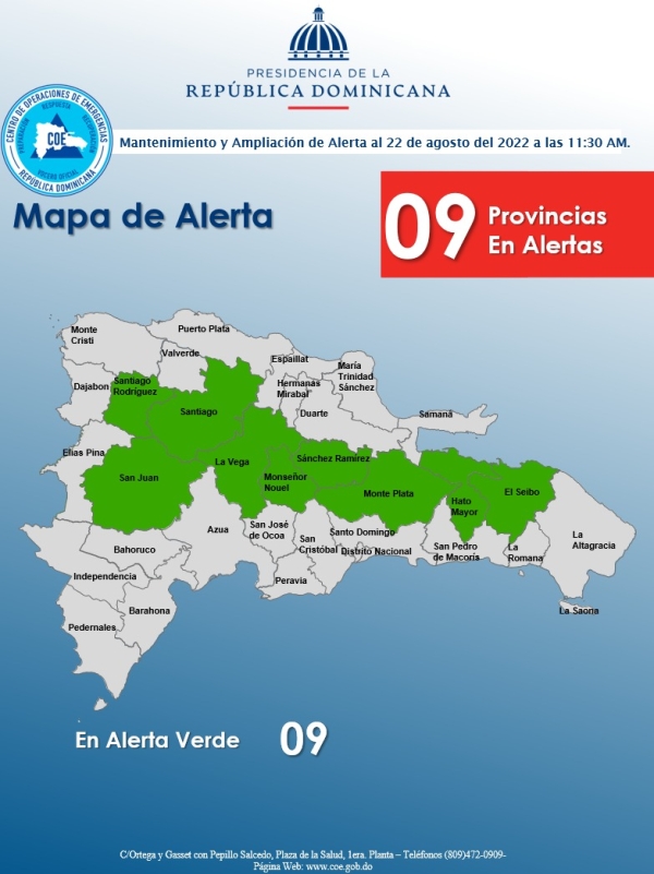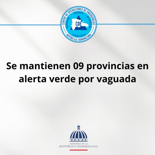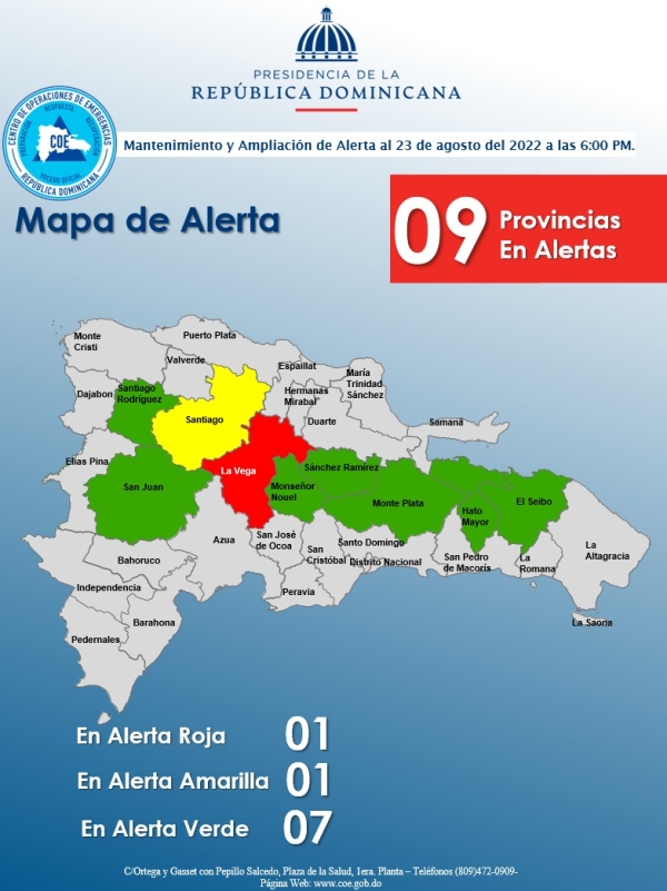El COE coloca 01 provincia en alerta roja, se mantiene 01 en alerta amarilla y 07 en alerta verde por posibles crecidas de ríos, arroyos y cañadas, así como inundaciones repentinas o urbanas, debido a que los efectos de una vaguada provocarán lluvias durante la tarde y noche.