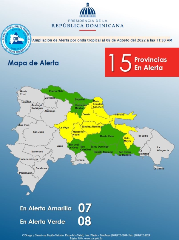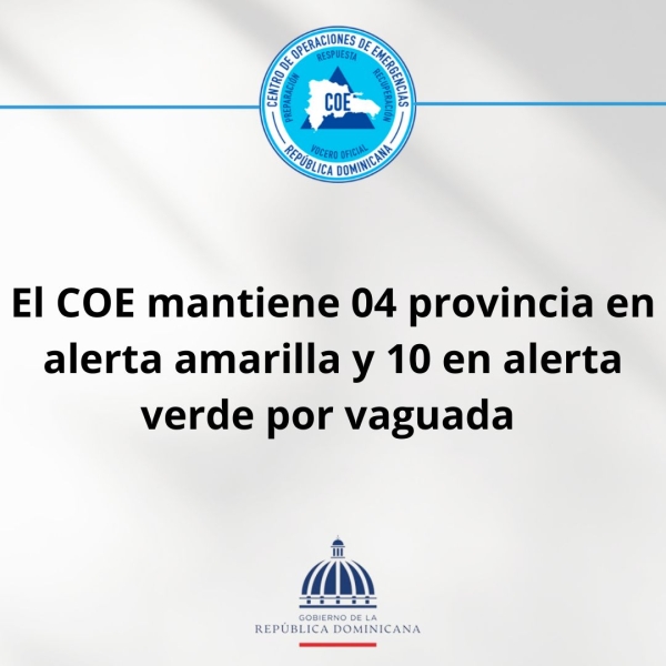 El Centro de Operaciones de Emergencias (COE), descontinúa el Nivel deALERTA VERDE por posibles crecidas de ríos, arroyos y cañadas, así comoinundaciones repentinas o urbanas, para las siguientes Provincias: El Gran SantoDomingo, San Pedro de Macorís, San José de Ocoa, Hermanas Mirabal, MaríaTrinidad Sánchez, San Cristóbal, Monte Plata, Espaillat, Puerto Plata, HatoMayor, Sánchez Ramírez, Duarte, Samaná, La Vega y Monseñor Nouel .