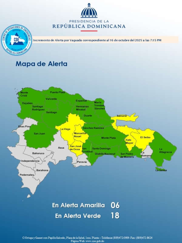 El COE mantiene 08 provincias y al Distrito Nacional en alerta roja, aumenta 13 en amarilla y mantiene 03 en verde, debido a que la tormenta tropical Melissa, No. 13 de esta Temporada Ciclónica 2025, fue localizada recientemente a unos 485 kilómetros al sur/suroeste de Puerto Príncipe (Haití).